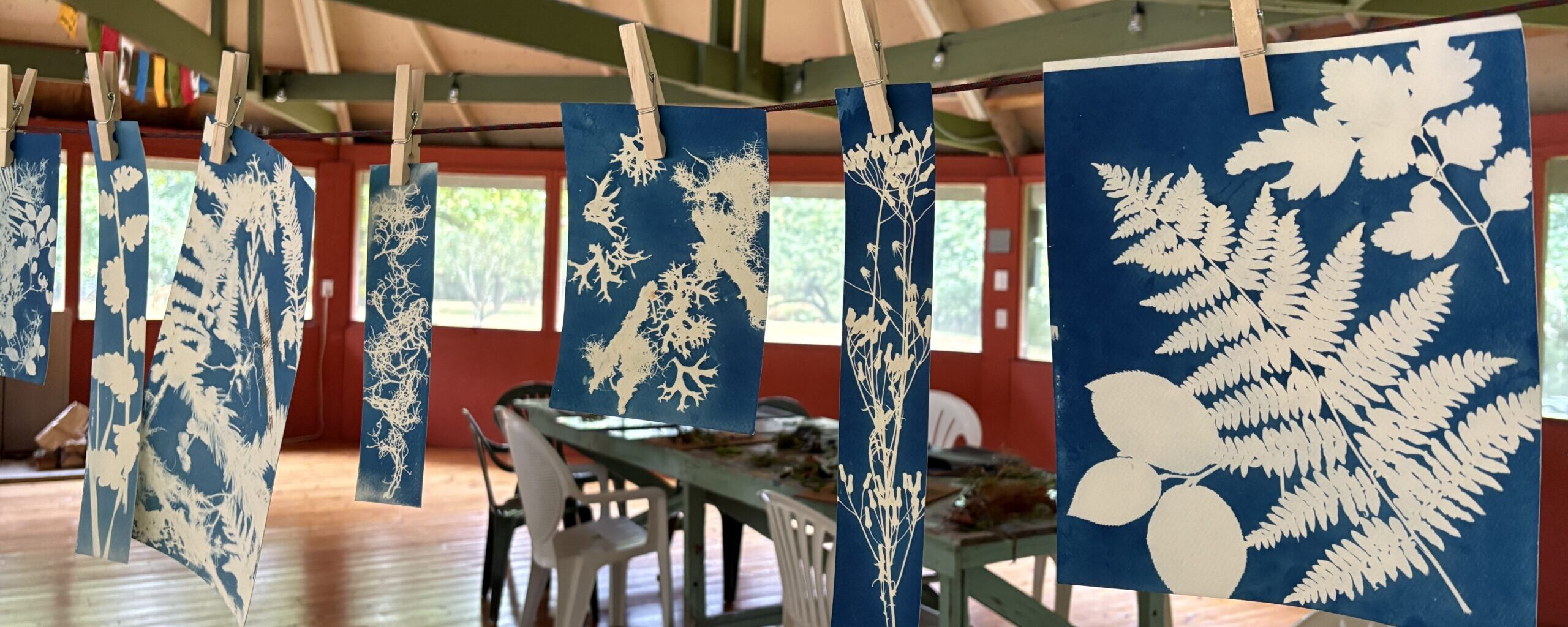 This workshop will guide participants through the creation of cyanotype prints, an ancient photographic technique that dates back over 200 years. Using the sun’s UV light, light-sensitive paper, and natural materials, we will produce beautiful cobalt blue images. Using the beauty of Indralaya’s setting as our studio, you will learn each step of the traditional and the more experimental ‘wet’ cyanotype process, including preparing the solution, treating the paper, creating images, exposing them to light, and fixing the color. Additionally, participants can bring a natural fabric item—such as a t-shirt, pillowcase, or bandana—to print on during the workshop.
