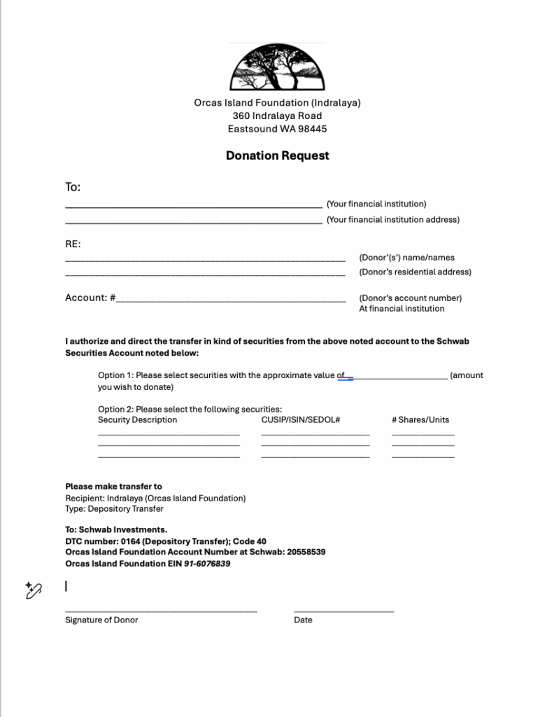 Contact your broker and let them know you would like to transfer stock to Indralaya (Orcas Island Foundation). The transfer is called a “ Depository Transfer” through Schwab Investments.